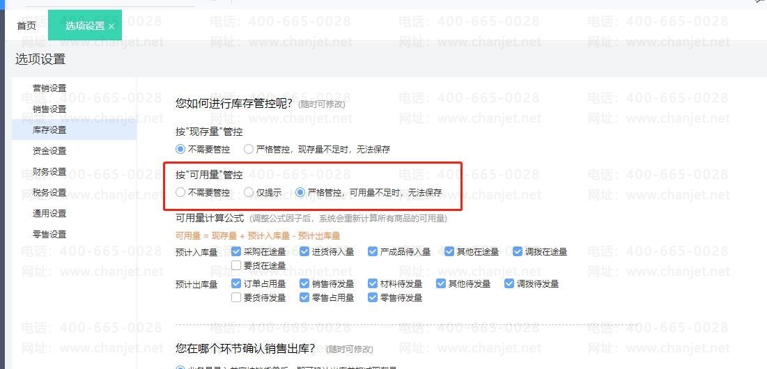 然后点击【系统管理】-【选项设置】-【库存设置】,将可用量严格管控即可。