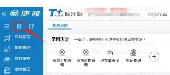 登录系统:打开畅捷通T+专属云标准版,点击左上角的放大镜图标。