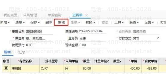 审核单据:直接双击打开未审核的单据,点击“审核”即可。