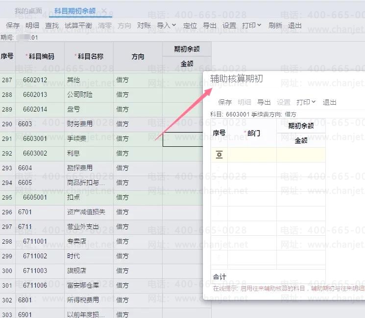 2、如果科目挂了辅助核算,并且有期初余额,需要录入科目辅助核算期初。例如,费用类科目挂了辅助核算,在辅助核算期初里按辅助核算部门录入汇总数据,保存后生成科目期初余额。