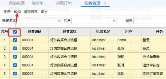 3、如果按以上都操作了,还是不能结账,这就有异常了,需要到任务管理中进行解锁操作,鼠标点击系统管理-任务管理,然后全选再点击解锁,如图下操作: