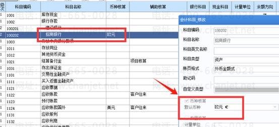 4、银行存款二级科目,在币种核算中要设置为外币,如图下科目,默认币种为欧元