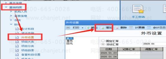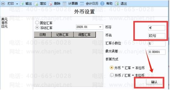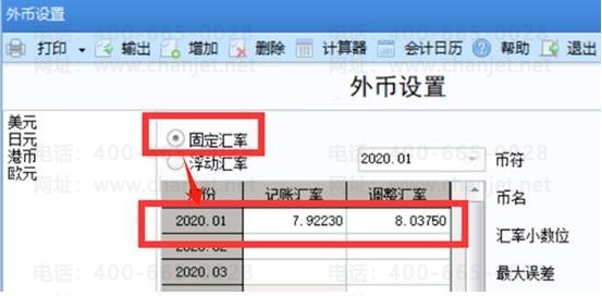 3、此时还需要设置汇率,汇率可以为固定汇率与浮动汇率,固定汇率是此月的每天都使用相同的汇率,录入一个记账汇率,月底再录入一个调整汇率,如图下: