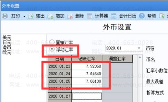 浮动汇率由于每天的汇率不同,需要录入所在月份的每日汇率,如图下: