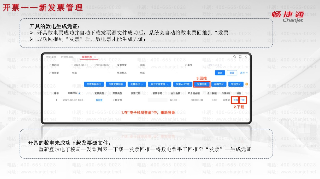 ➢ 开具数电票成功并自动下载发票源文件成功后,系统会自动将数电票回推到“发票”;➢ 成功回推到“发票”后,数电票才能生成凭证;