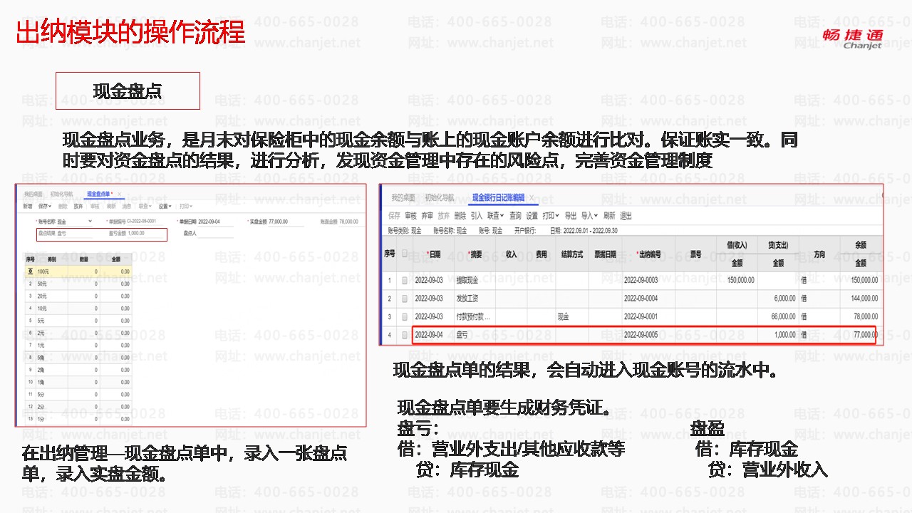 现金盘点业务,是月末对保险柜中的现金余额与账上的现金账户余额进行比对。保证账实一致。同时要对资金盘点的结果,进行分析,发现资金管理中存在的风险点,完善资金管理制度。