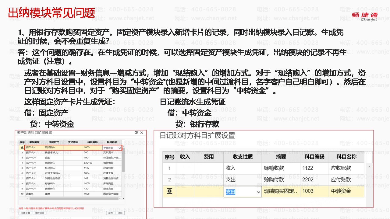 答:这个问题的确存在。在生成凭证的时候,可以选择固定资产模块生成凭证,出纳模块的记录不再生成凭证(注意)。