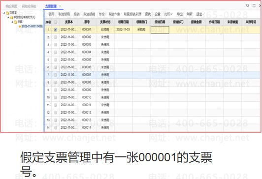 假定支票管理中有一张000001的支票号。