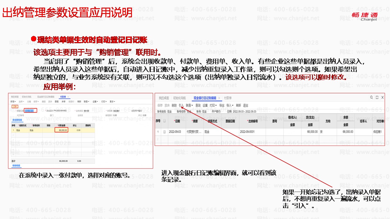 当启用了“购销管理”后,系统会出现收款单、付款单、费用单、收入单。有些企业这些单据都是出纳人员录入,希望出纳人员录入这些单据后,自动进入日记账中,减少出纳重复录入工作量,则可以勾选则个选项。如果希望出纳是独立的,与业务系统没有关联,则可以不勾选这个选项(出纳单独录入日常流水)。该选项可以随时修改。