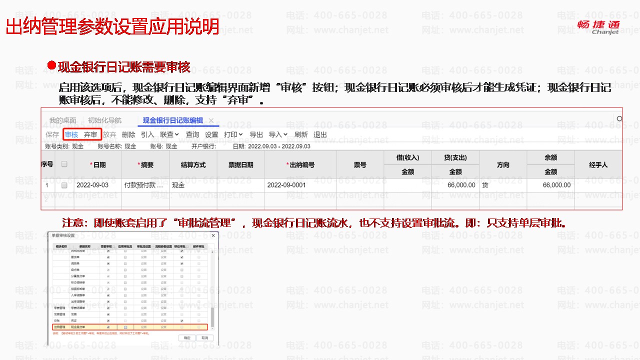 启用该选项后,现金银行日记账编辑界面新增“审核”按钮;现金银行日记账必须审核后才能生成凭证;现金银行日记账审核后,不能修改、删除,支持“弃审”。