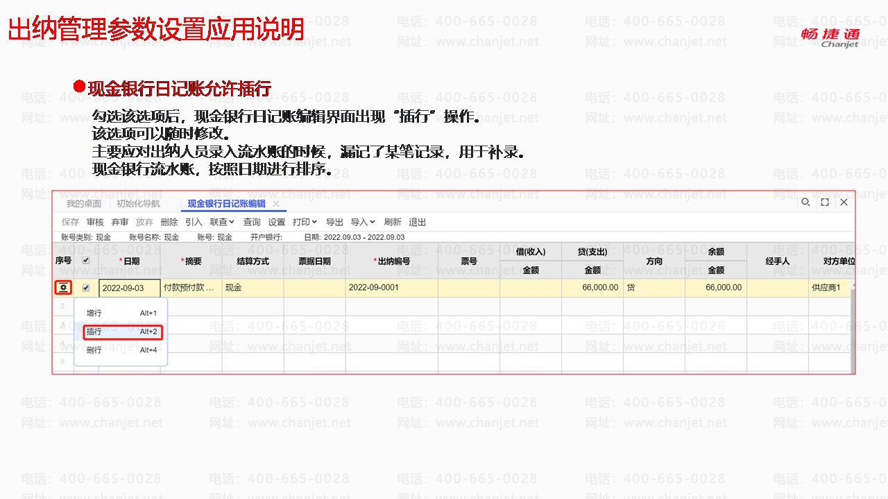 勾选该选项后,现金银行日记账编辑界面出现“插行”操作。