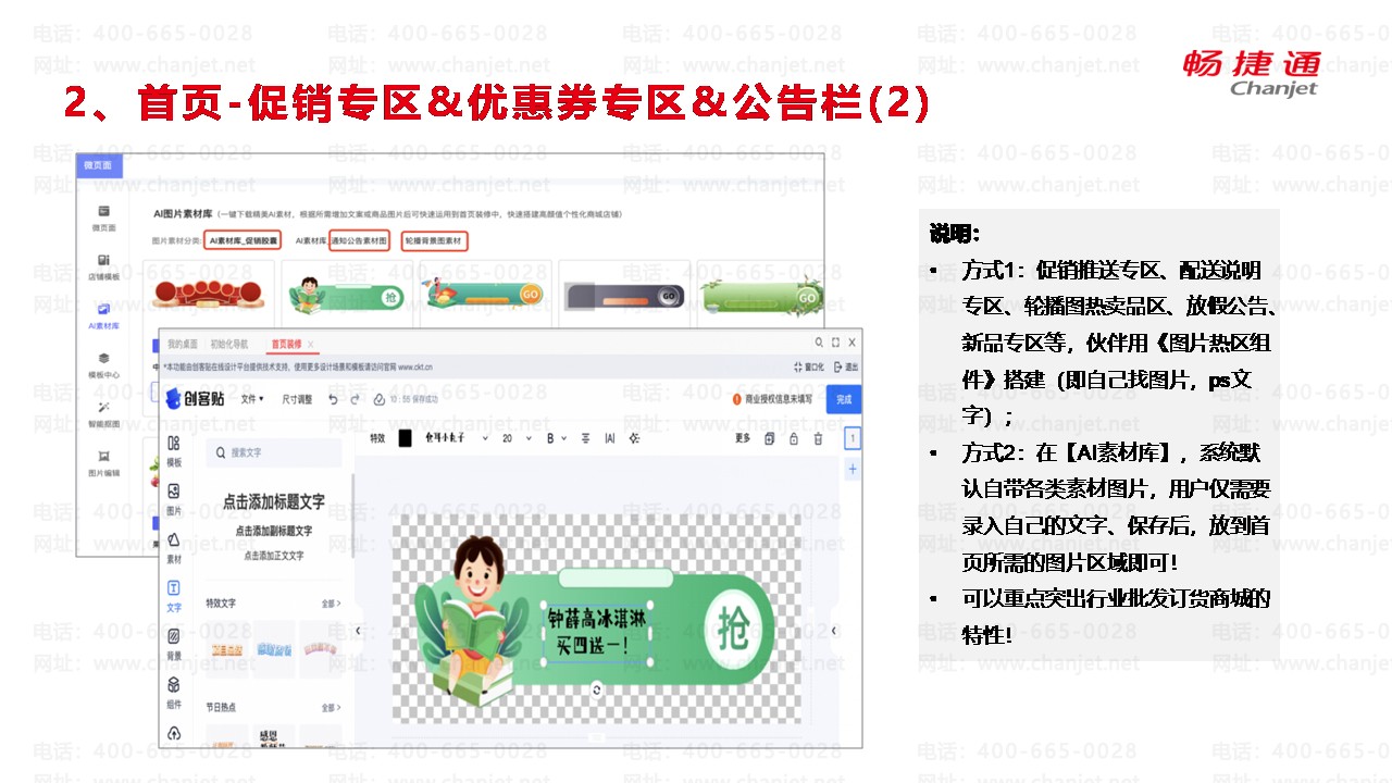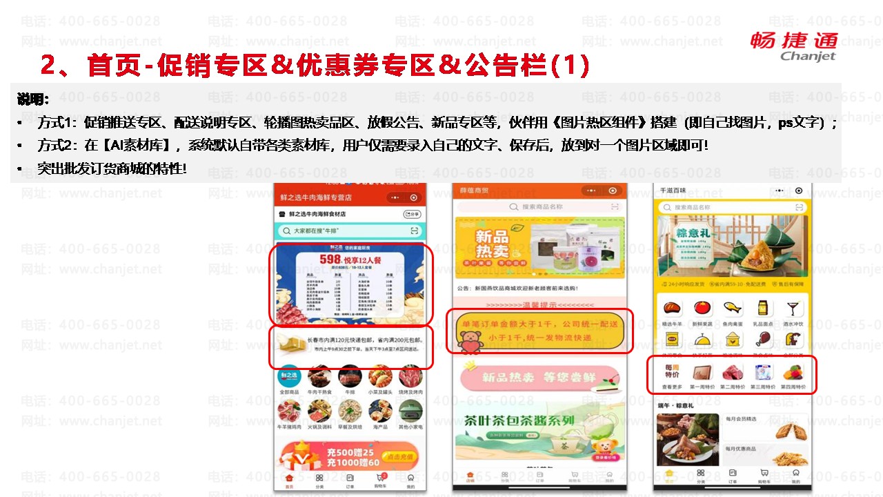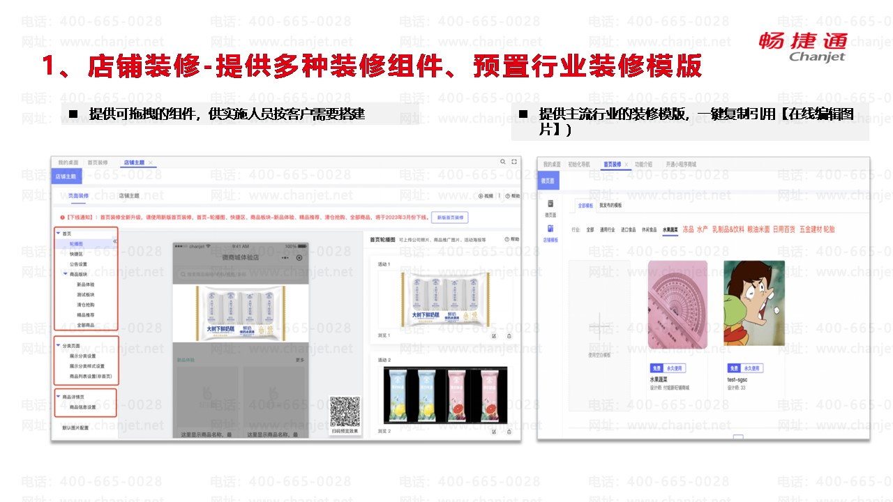 1、店铺装修-提供多种装修组件、预置行业装修模版