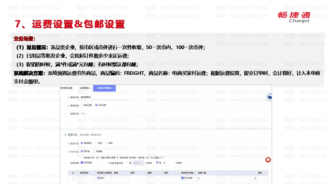 系统解决方案:系统预置运费劳务商品,商品编码:FREIGHT,商品名称:电商买家付运费;根据运费设置,提交订单时,会计算好,计入本单应支付金额里。