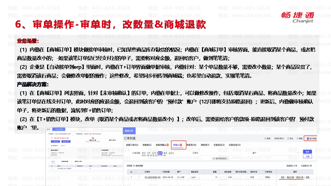 (2)企业是【自动接单到erp】里面时,内勤在T+订单界面做单据审核,内勤针对:某个单品数量不够,需要改小数量;某个商品没货了,需要取消该行商品;会做修改单据的操作;这些修改,希望同步回传到商城端;也希望自动退款,实现笔笔清。