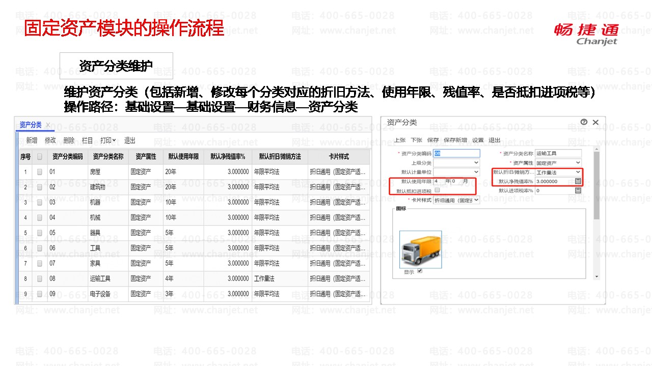 维护资产分类(包括新增、修改每个分类对应的折旧方法、使用年限、残值率、是否抵扣进项税等)