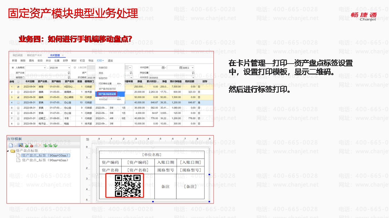 在卡片管理—打印—资产盘点标签设置中,设置打印模板,显示二维码。