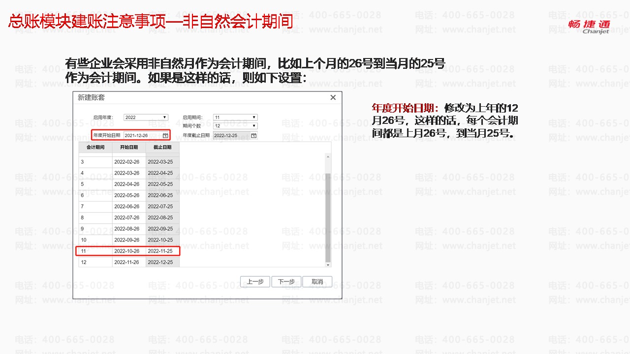 有些企业会采用非自然月作为会计期间,比如上个月的26号到当月的25号作为会计期间。如果是这样的话,则如下设置: