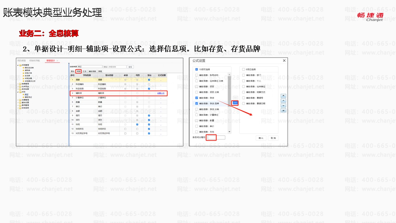 2、单据设计-明细-辅助项-设置公式:选择信息项。比如存货、存货品牌