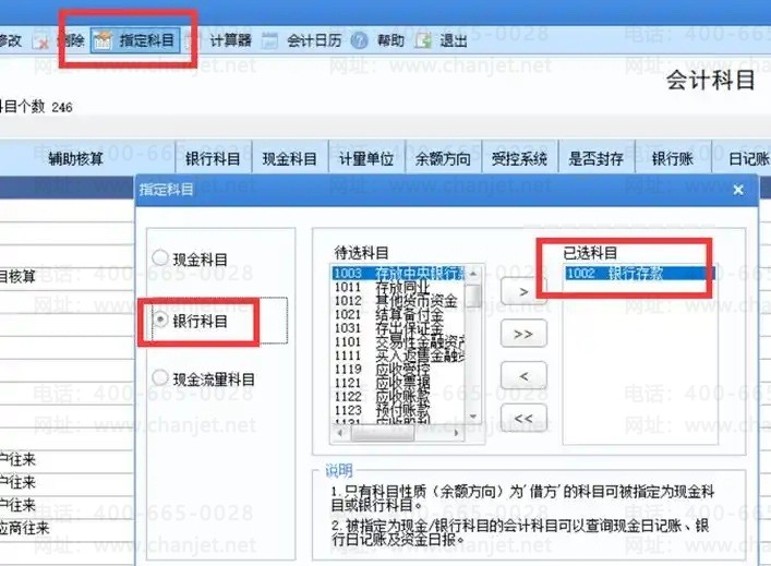 1. 操作方法:选择指定科目-银行科目,从待选科目里把银行科目放到已选科目里。 (注:这里只能选择一级科目,不能按明细科目去选择)