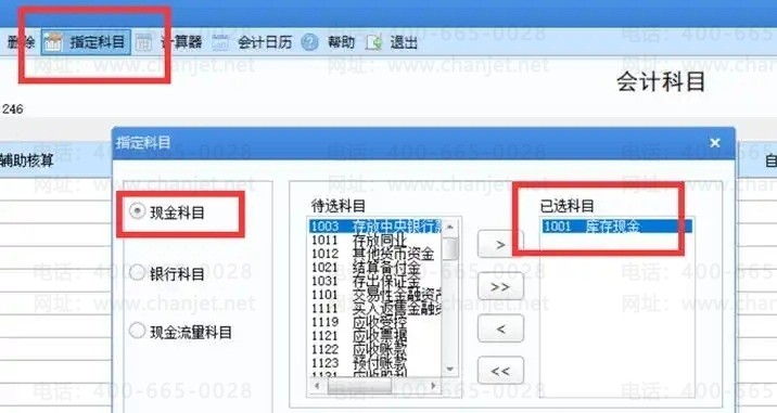 1. 操作方法:选择指定科目-现金科目,从待选科目里把现金科目放到已选科目里,如图“1001库存现金”。