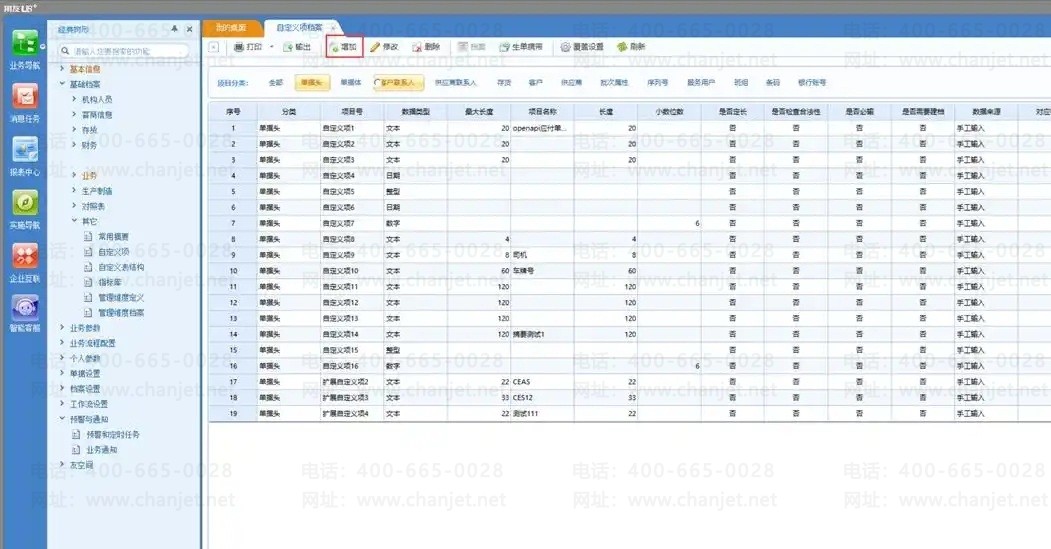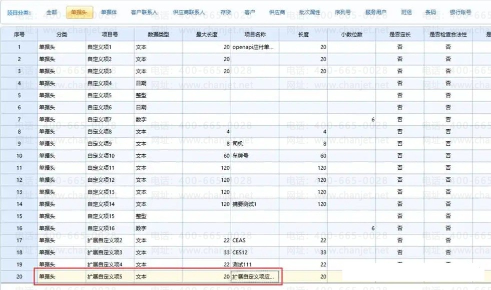 扩展自定义项数量:系统允许各分类下最多增加100个扩展自定义项。