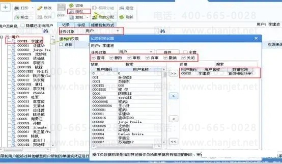 4、选择操作人员,业务对象=用户 授权,新界面中找到操作员自己的用户编码将自己编码选择到右侧 保存;(如果想查看、修改。。其他操作员单据操作方式相同)