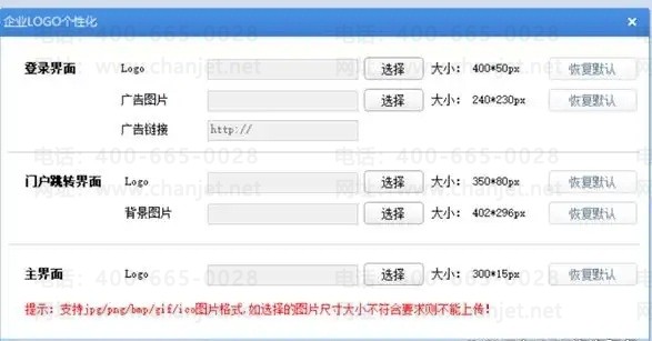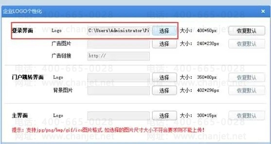 2. 选择登录界面-LOGO-点击选择-打开本地的400*50大小的图片(图片大小不符合要求则无法上传成功),图片格式可以为JPG/PNG/BMP/GIF/ICO。