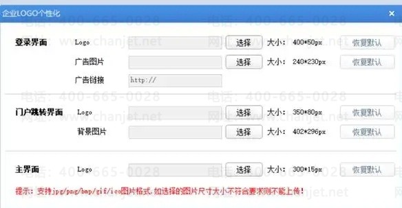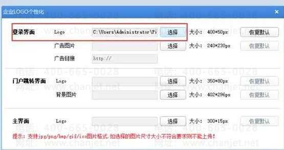 2. 选择登录界面-LOGO-点击选择-打开本地的400*50大小的图片(图片大小不符合要求则无法上传成功),图片格式可以为JPG/PNG/BMP/GIF/ICO。