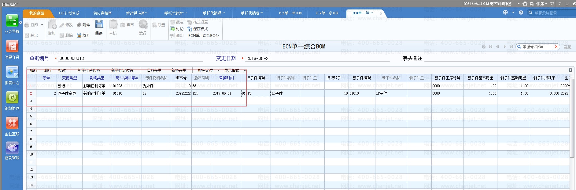 3、ECN单-综合BOM中可以同时对多个BOM不同子件做不同的变更