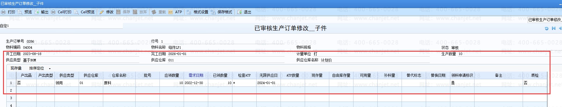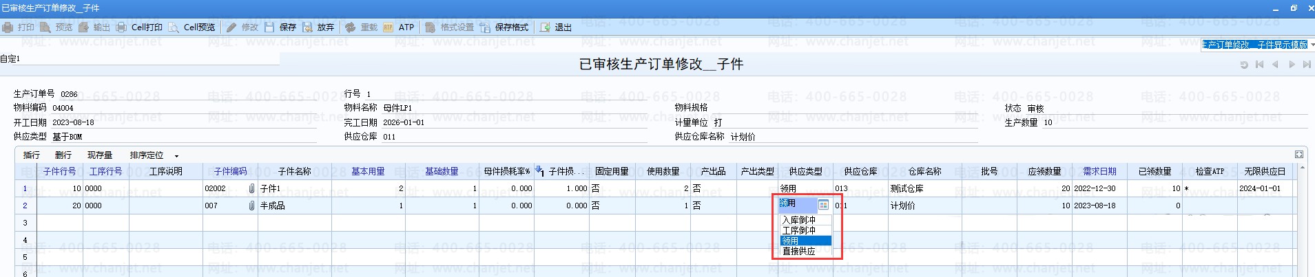 子件资料可以修改主要的字段应领数量、基本用量、基础数量、仓库、损耗率、供应类型、领料申请标识以及一些自定义项字段。