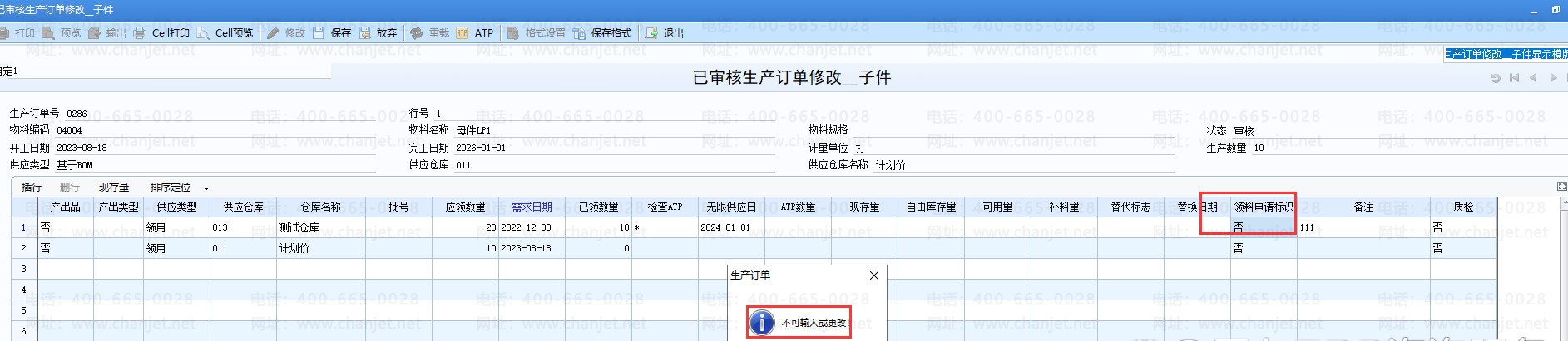 例如,已经做了申请领料,将领料申请标识修改为否,但是没有领料则可以直接修改