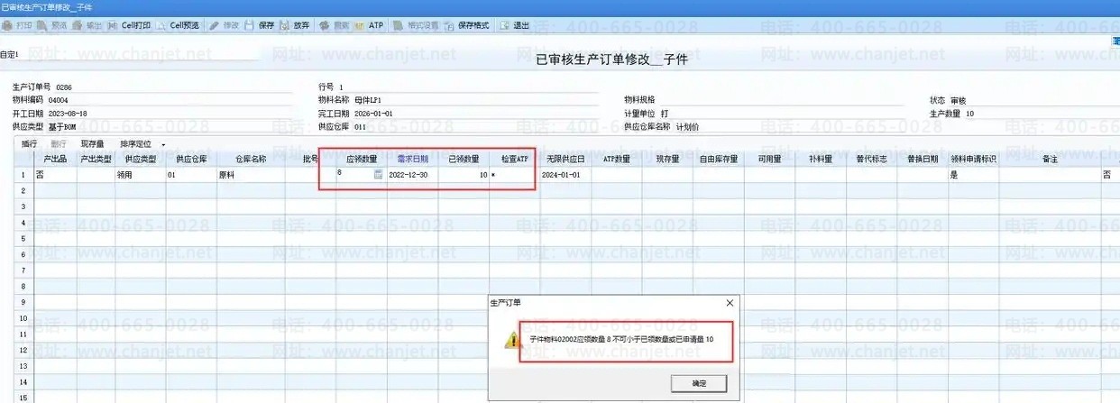 对已审核生产订单修改,修改数量字段,当数量小于已入库量会报错提示。若是已领料。修改生产的数量计算的应领数量小于已领,会提示应领不可小于已领或已申请量