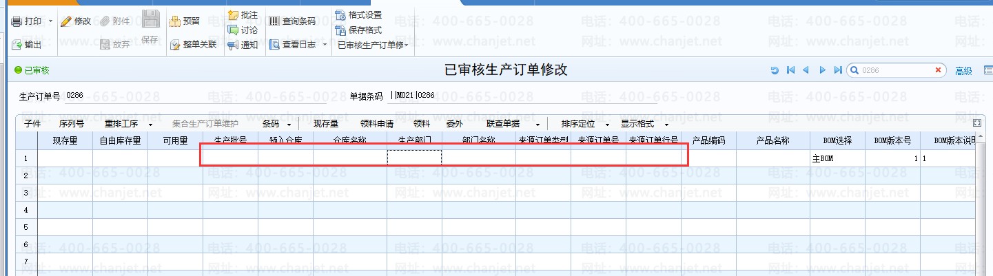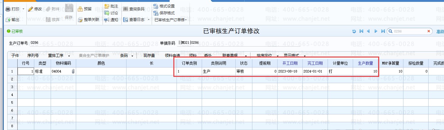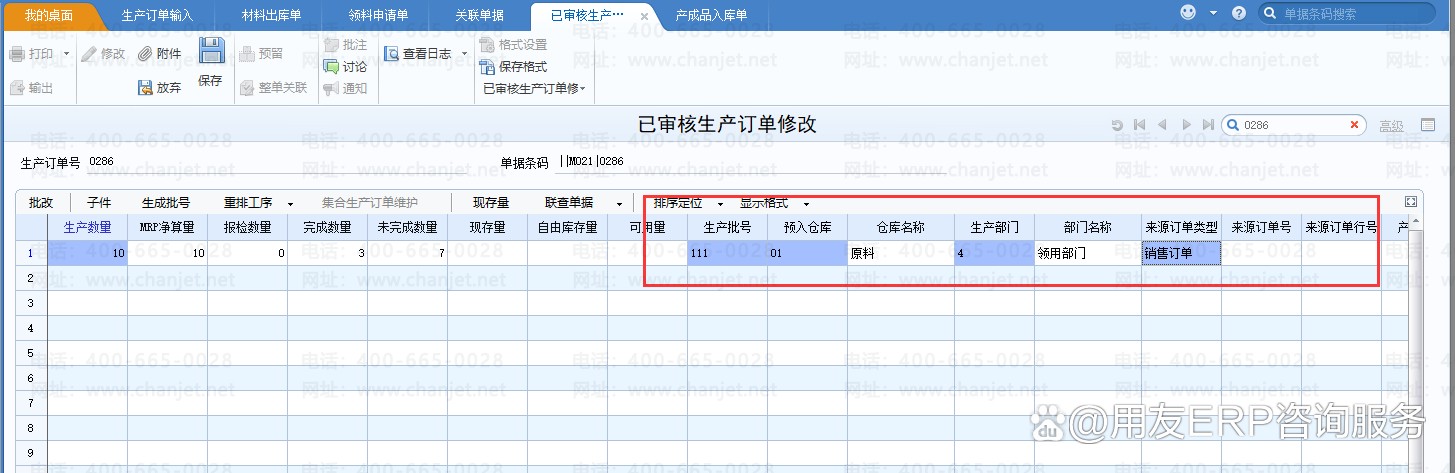 已审核生产订单修改,可以修改的字段,数量、开工日期、完工日期、部门、仓库以及表体自定义项等字段。