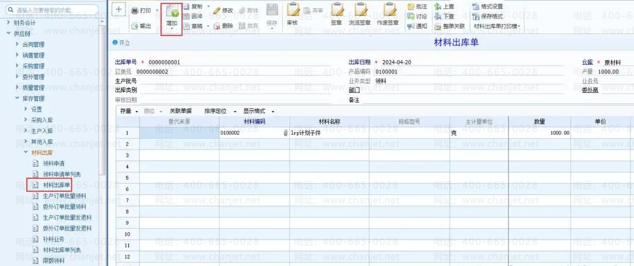 在供应链-库存管理-材料出库-材料出库单中点击增加选择参照生产订单生成材料出库单(注意:如果子件的领料申请标识为是,需要先参照生产订单生成领料申请单,再根据领料申请单生成材料出库单);