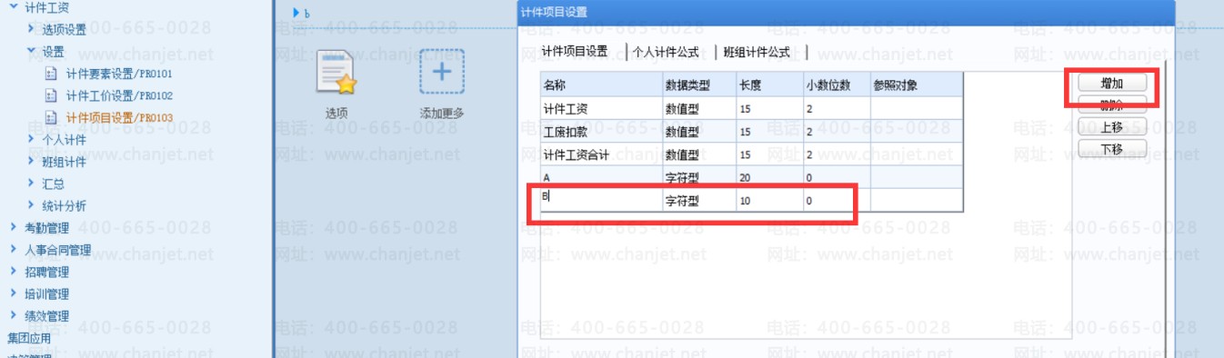 2、点击【增加】,维护“计件项目名称”“数据类型”“长度”“小数位”点击确定