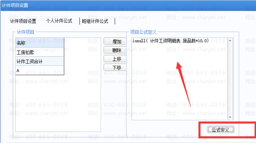 2、点击增加,选择【计件项目】,在公式定义中设置对应公式