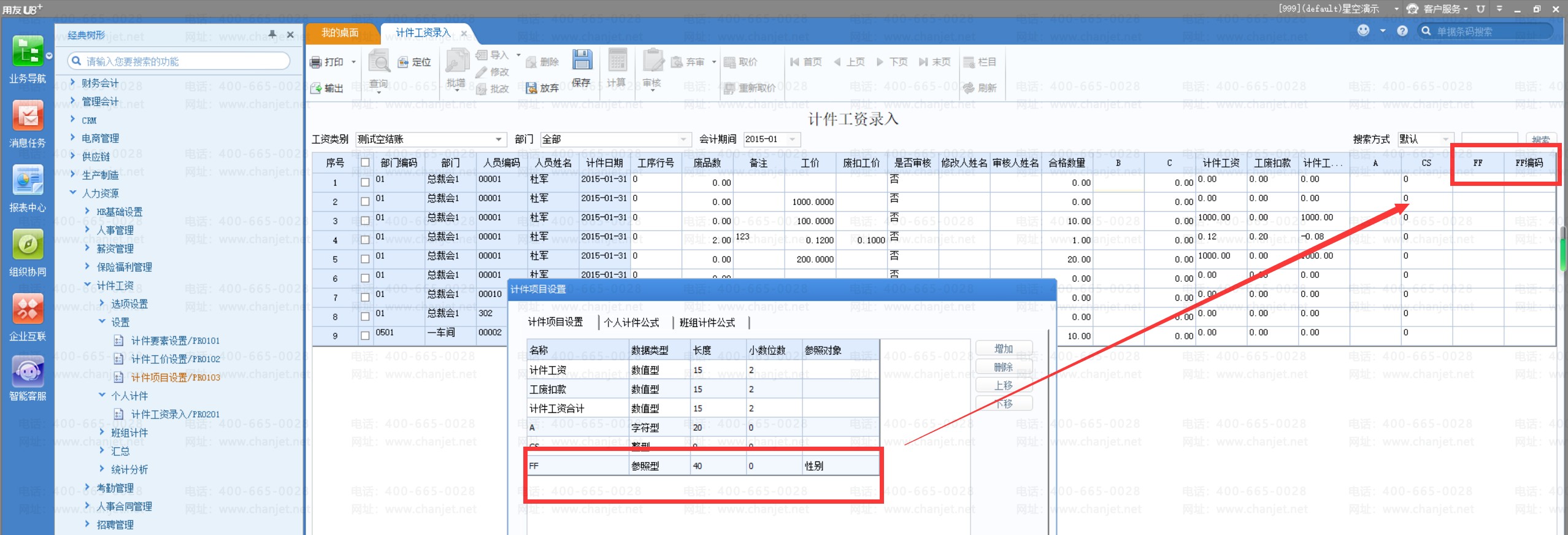 设置为参照型的计件项目,在计件工资录入界面系统将自动生成对应的“编码列”