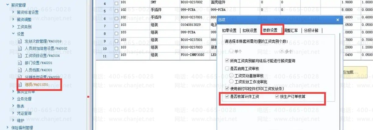 1、进入薪资管理,打开需要核算计件工资的工资类别,进"参数设置"页签,勾选"是否核算计件工资"、"按生产订单核算"两个选项。