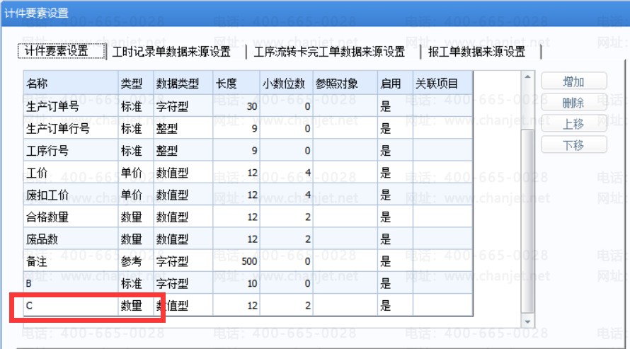 3、如果增加的自定义要素的类型为“数量”,可在其他三个页签显示该字段,用于与工时记录单等相匹配