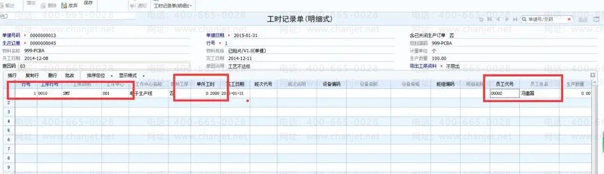 3、进入车间管理模块,录入生产订单工时记录单及员工明细,录入员工数据时要
