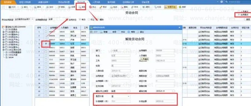 5、解除劳动合同:进入人事合同管理-劳动合同-劳动合同里,合同模式下选择合同点击【解除】,是否计算选择“是”,再保存之后就会自动计算出补偿期限和补偿金额。
