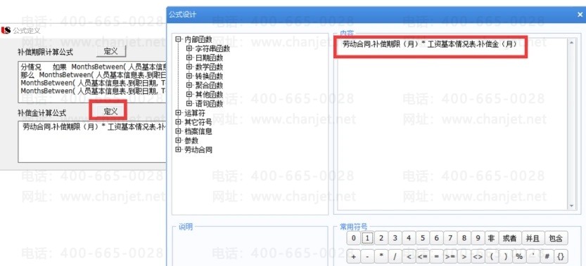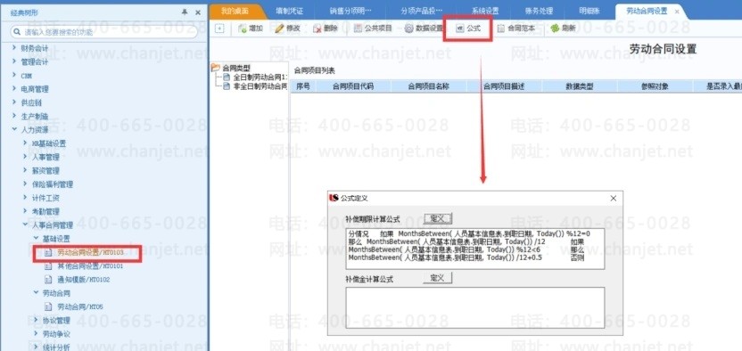 3、进入人事合同管理-设置-劳动合同设置,点击【公式】,补偿期限的计算公式系统已经预制好了,是以人员档案的到职日期到现在的北京时间日期来计算补偿期限的;如果要按其他逻辑来计算补偿期限也可以修改此公式。