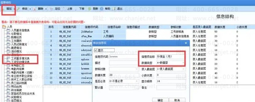 1、在基础设置-系统设置-信息结构里的工资基本情况表中,增加一个项目为【补偿金(月)】,注意数据类型必须为“数值型”,勾选“显示”;