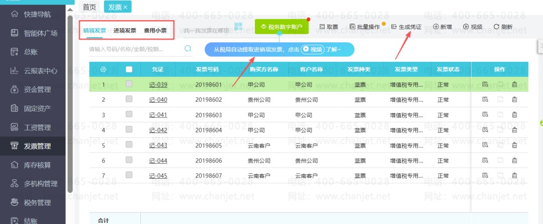 1、智能发票管理,自动识别发票信息,一键生成凭证