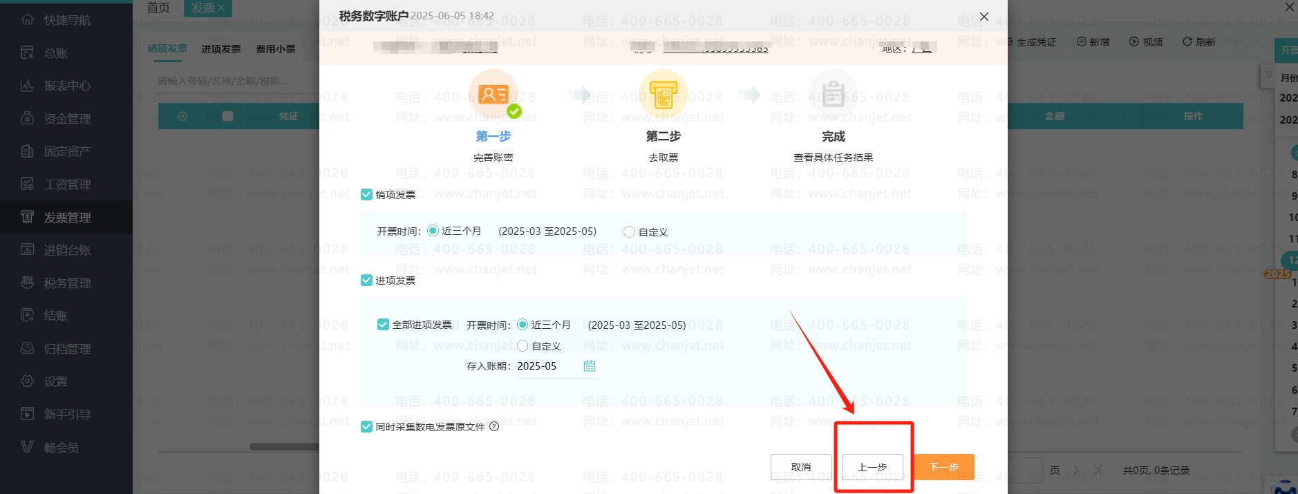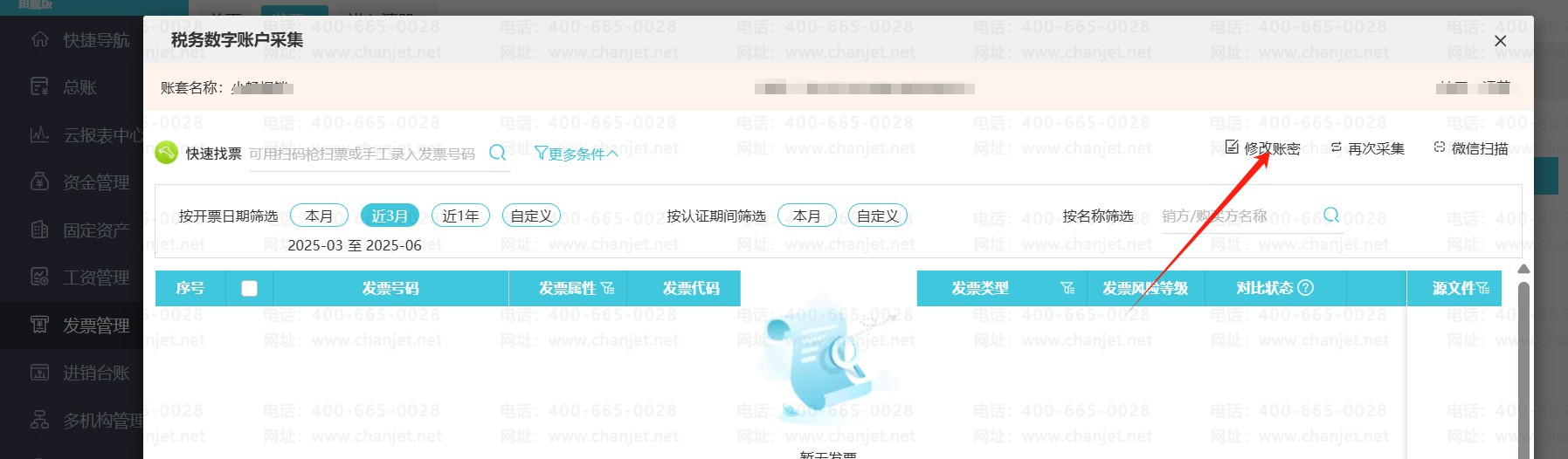 点击【发票管理】-【发票】-【税务数字账户】-【修改账密】-选择与平时登录税局的方式一致