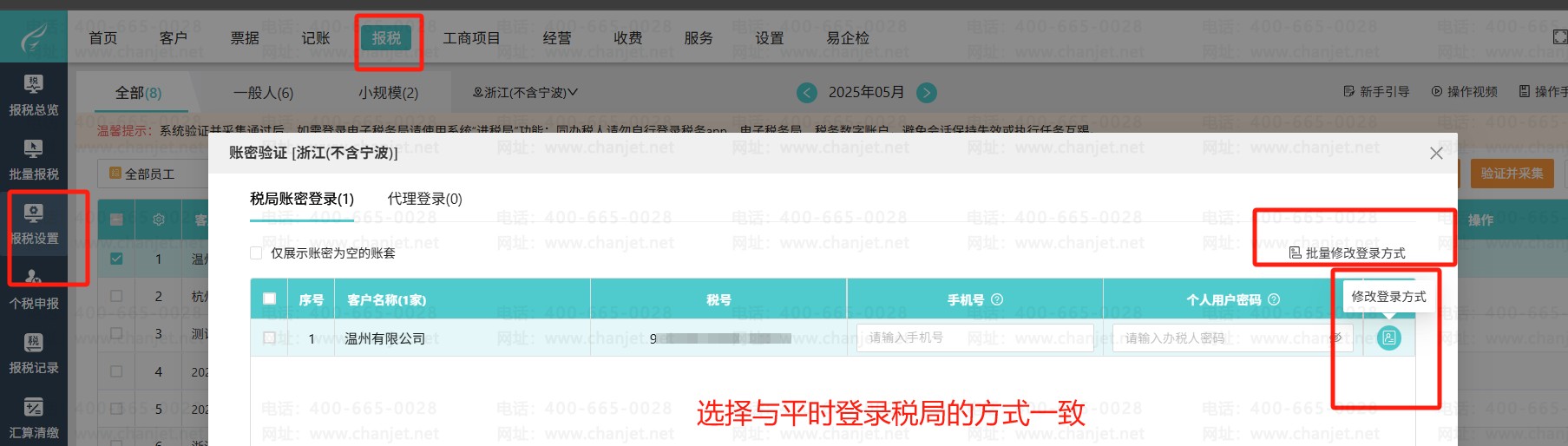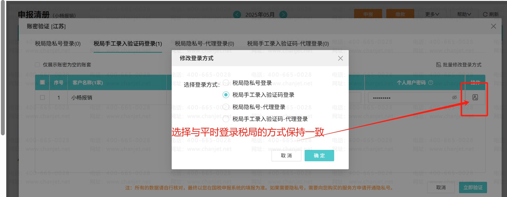 【易代账工作台】-【报税设置】-【验证账密】-选择与平时登录税局的方式一致