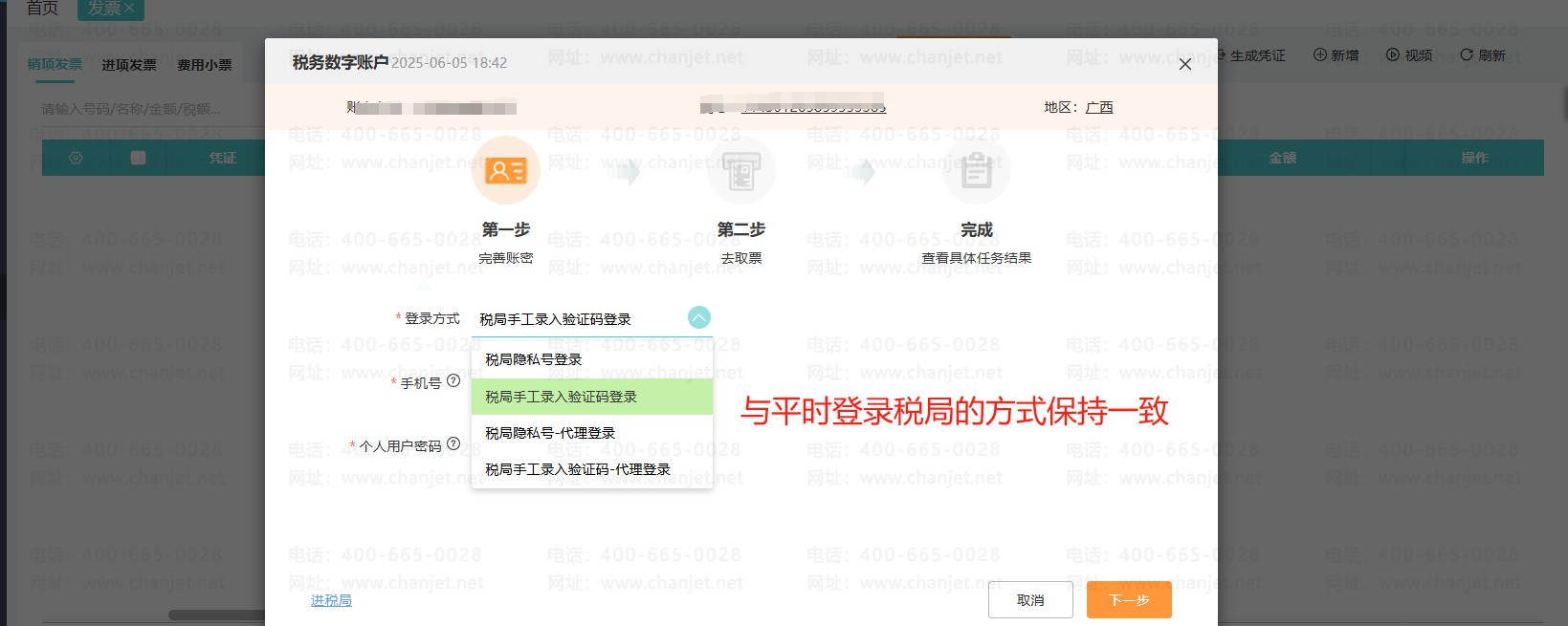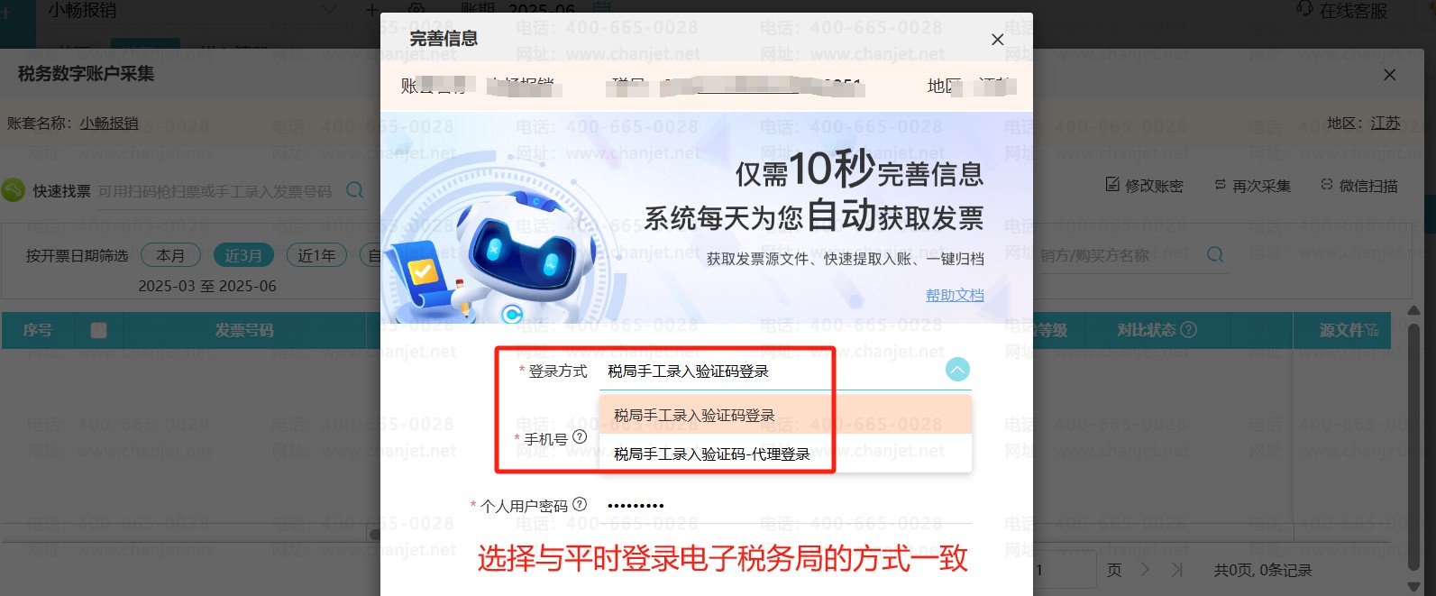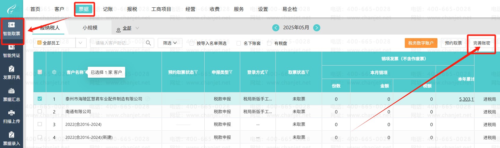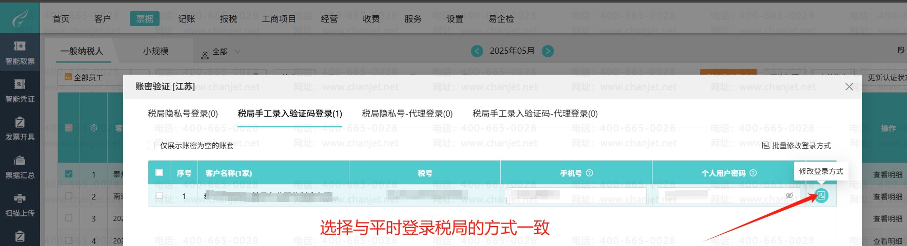 【易代账工作台】-【票据】-【智能取票】-【完善账密】-选择与平时登录税局的方式一致