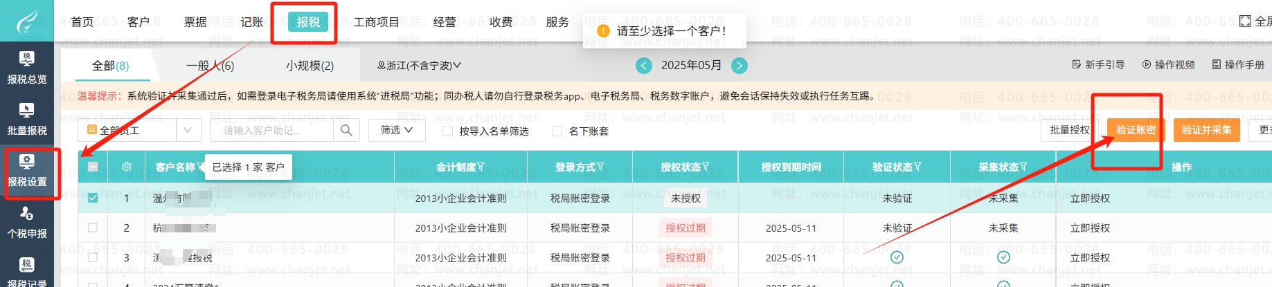 点击【税务管理】-【税务申报】-点击对应的地区进入-右上角【更多】-【验证并采集】-选择与平时登录税局的方式一致
