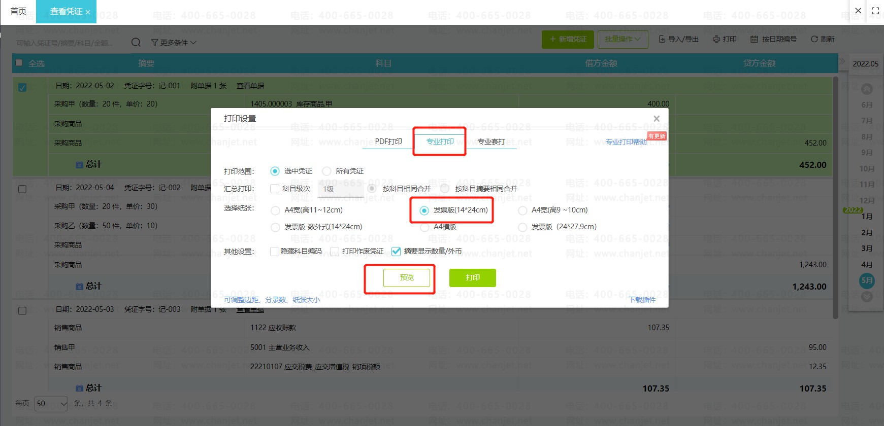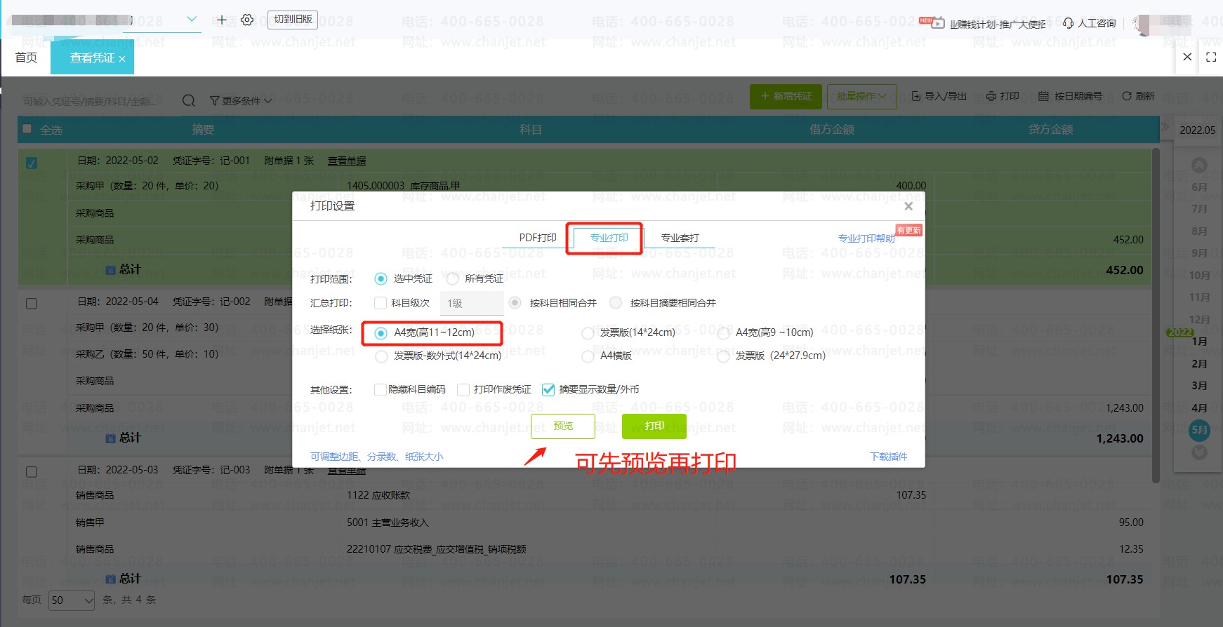 专业打印效果同 PDF 打印比较,区别在于专业打印可以自定义凭证与凭证之间的间距、每页打印单据数、凭证分录数、凭证间距、自由选择是否打印凭证分割线等。在凭证一查看凭证界面,勾选需要打印的凭证,点击打印-专业打印,选择打印模板,再点击预览即可调整。