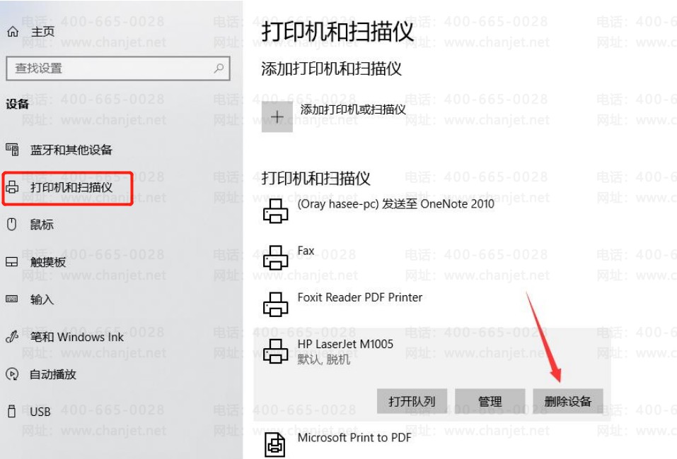 1、方式一、删除所有错误的打印机(找到【设置】-【打印机和扫描仪】,点击错误的打印机,点击【删除】按钮,默认为可正常使用的打印机上即可);